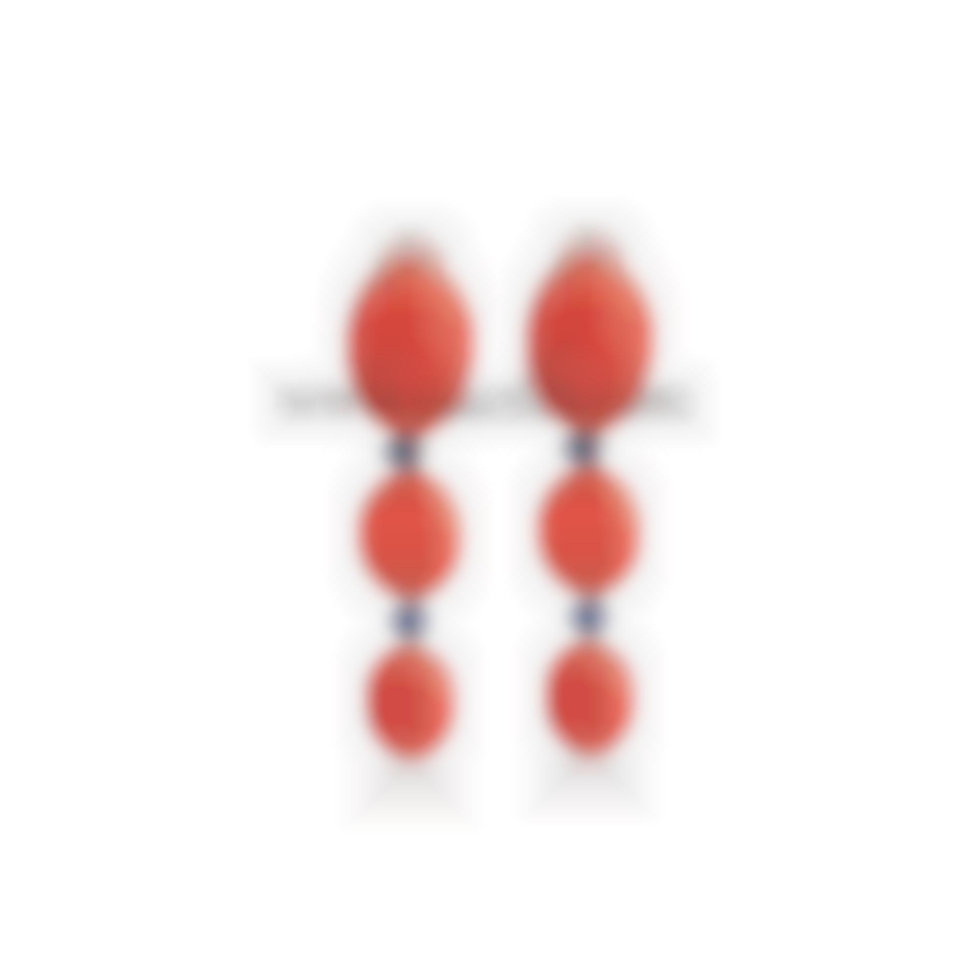 The 18-carat gold earrings with natural sapphires and natural red coral from the Mediterranean exemplify exquisite craftsmanship, entirely crafted in our workshop in Torre del Greco. The detailed workmanship highlights meticulous attention to each individual element. The body of the earrings is made of 18-carat gold, ensuring not only timeless elegance but also enduring quality. The precious stones are natural sapphires, carefully chosen for their brilliance and vibrant color. The natural red coral from the Mediterranean, cut and worked with precision in our workshop, adds a unique and distinctive touch to this jewel. Earrings - Gold gr 5.00 - Coral gr 3.30 - Shappires p.4 ct 0.38