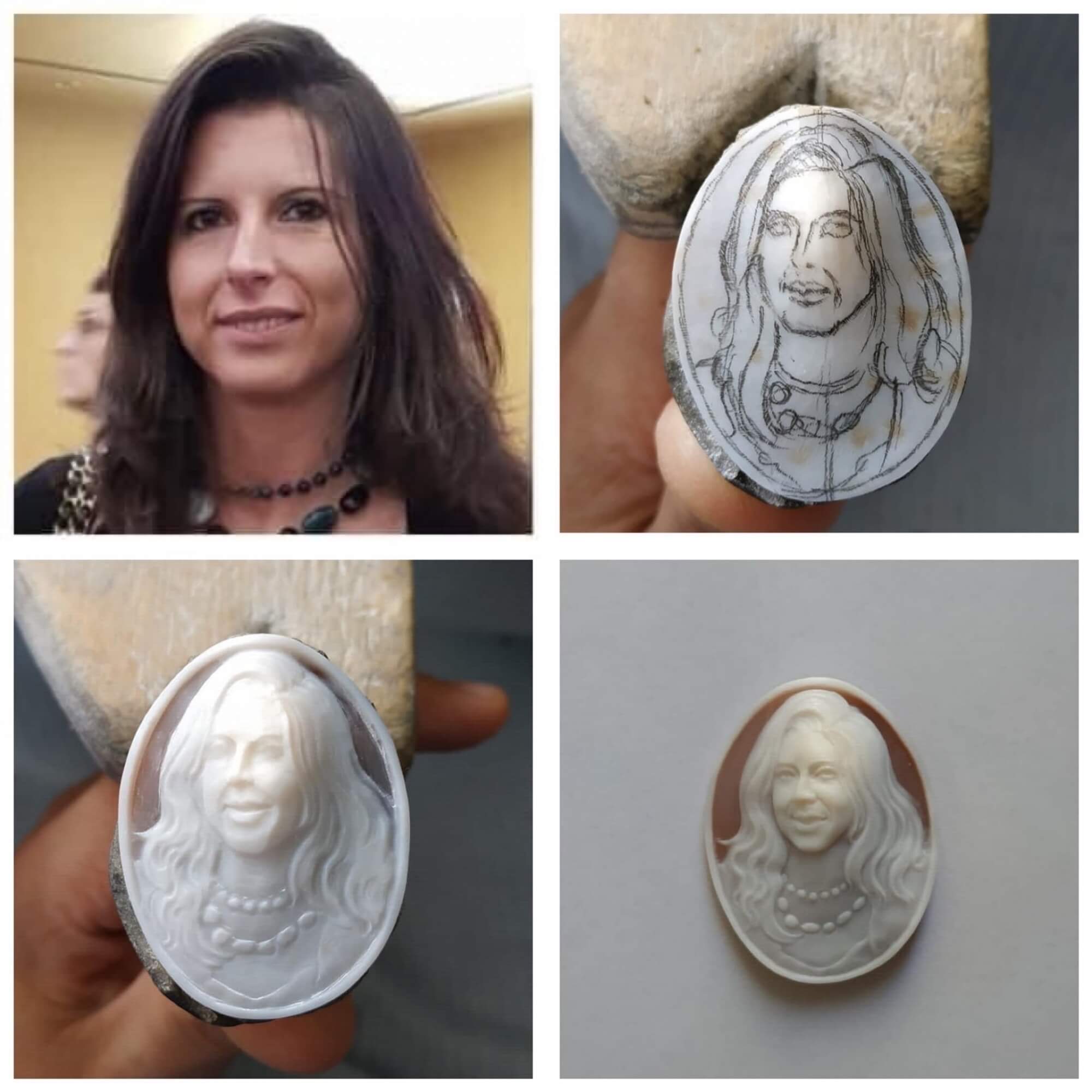 Almost any subject can be engraved on the cameo, even a cameo portrayed from a photograph. The personalization of the photographic cameo is perhaps the most difficult engraving to make, as the shell does not have different colors, but only 2. With a play of chiaroscuro, it is necessary to engrave on the shell and capture the somatic features of the subject. It requires a lot of skill and a dexterity in engraving cameos of years and years of experience.